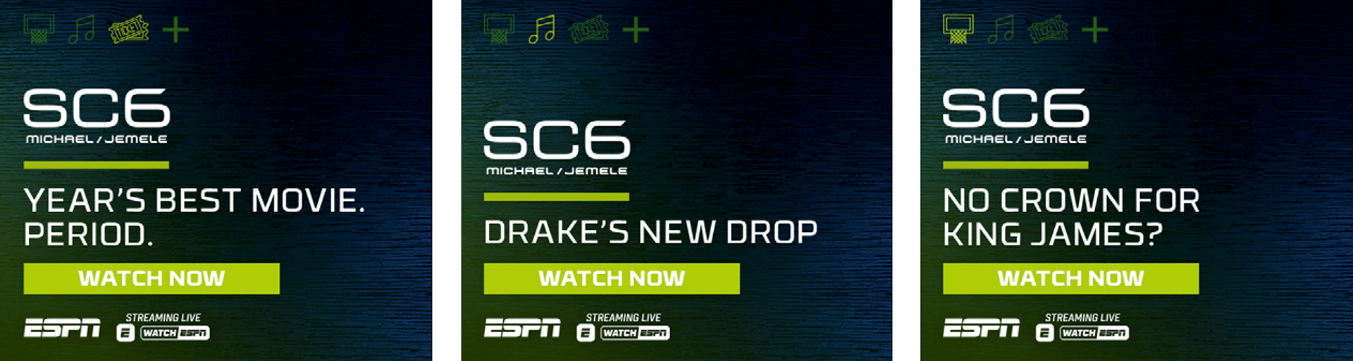 SC6 is ESPN SportsCenter's millennial-friendly franchise. The topics discussed on the show go beyond sports. The co-anchors discuss movies, music and pop culture topics. The visual positioning of this franchise had to be lighthearted, but credible. I was on the team responsible for branding, marketing, and promoting ESPN's SC6. My duties entailed helping with visual positioning, campaign development, and design of the campaign deliverables. The scope of design work consisted of: on-air graphics, print/digital ads, and social media promotional content and templates.